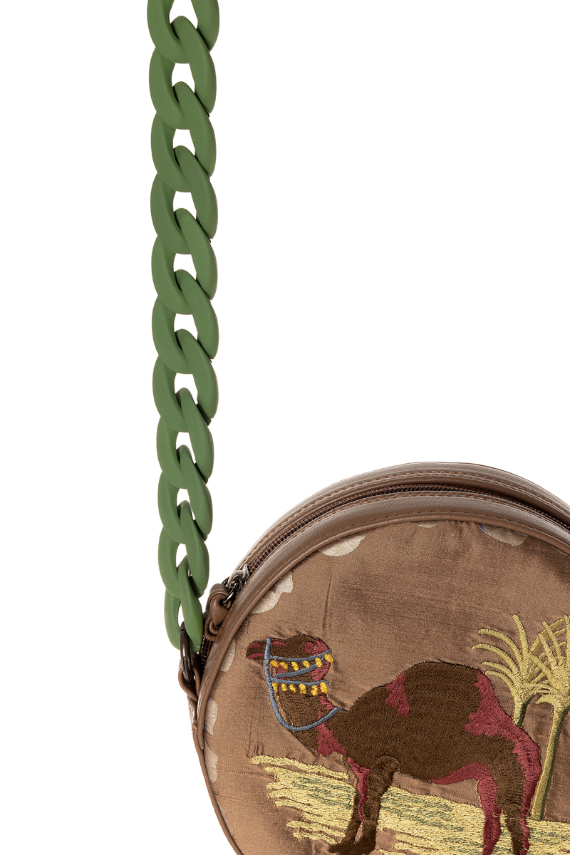 Στρογγυλή τσάντα διπλής όψεως από βισκόζ-μετάξι και δέρμα.