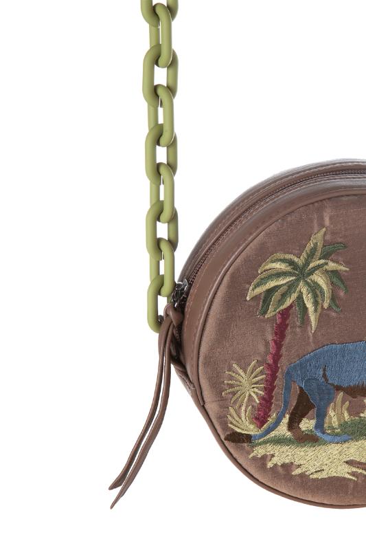 Στρογγυλή τσάντα διπλής όψεως από βισκόζ-μετάξι και δέρμα.