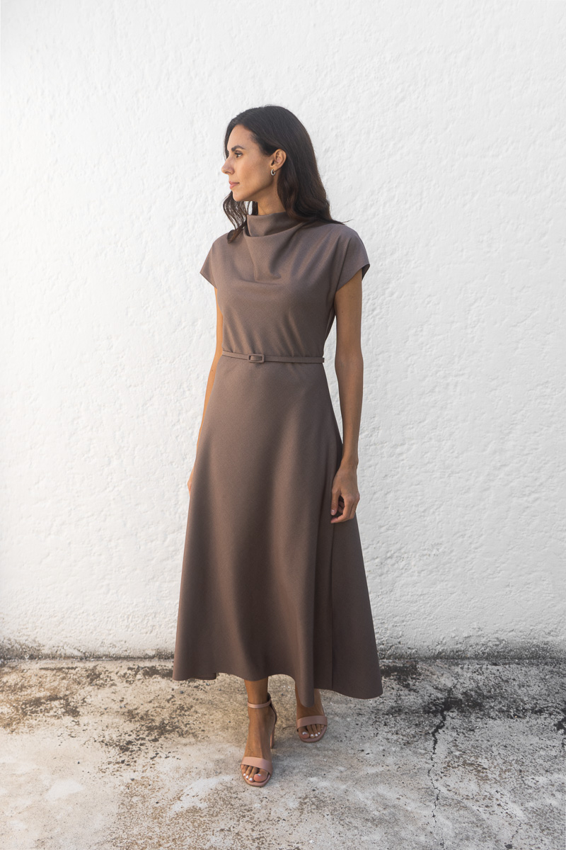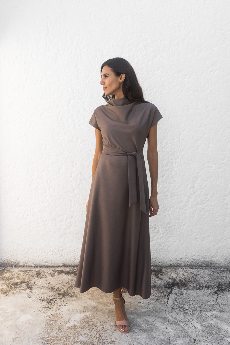 An elegant midi dress that embodies timeless refinement and modern simplicity. It features a subtle high neckline and short raglan sleeves that create a refined aesthetic, while the soft, cut of the skirt drapes naturally over the body.